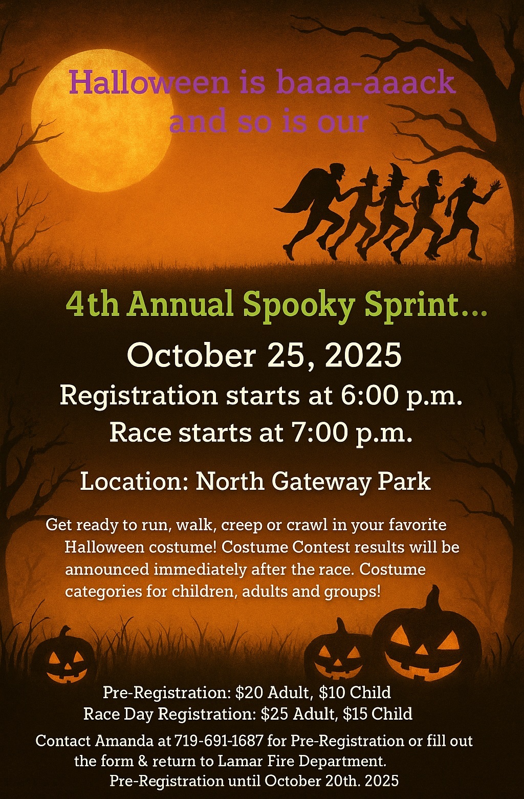 North Gateway Park LamarJoin us for the 4th Annual Spooky Sprint in Lamar, Colorado! 👻🎃 Get ready to lace up your running shoes (or your spookiest costume!) for a fun-filled day.