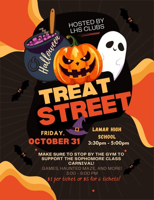Join the LHS Clubs for their annual Treat Street on Friday, October 31st! Wear your costumes and come to Lamar High School for a safe and fun trick-or-treating experience. We can't wait to see you there!